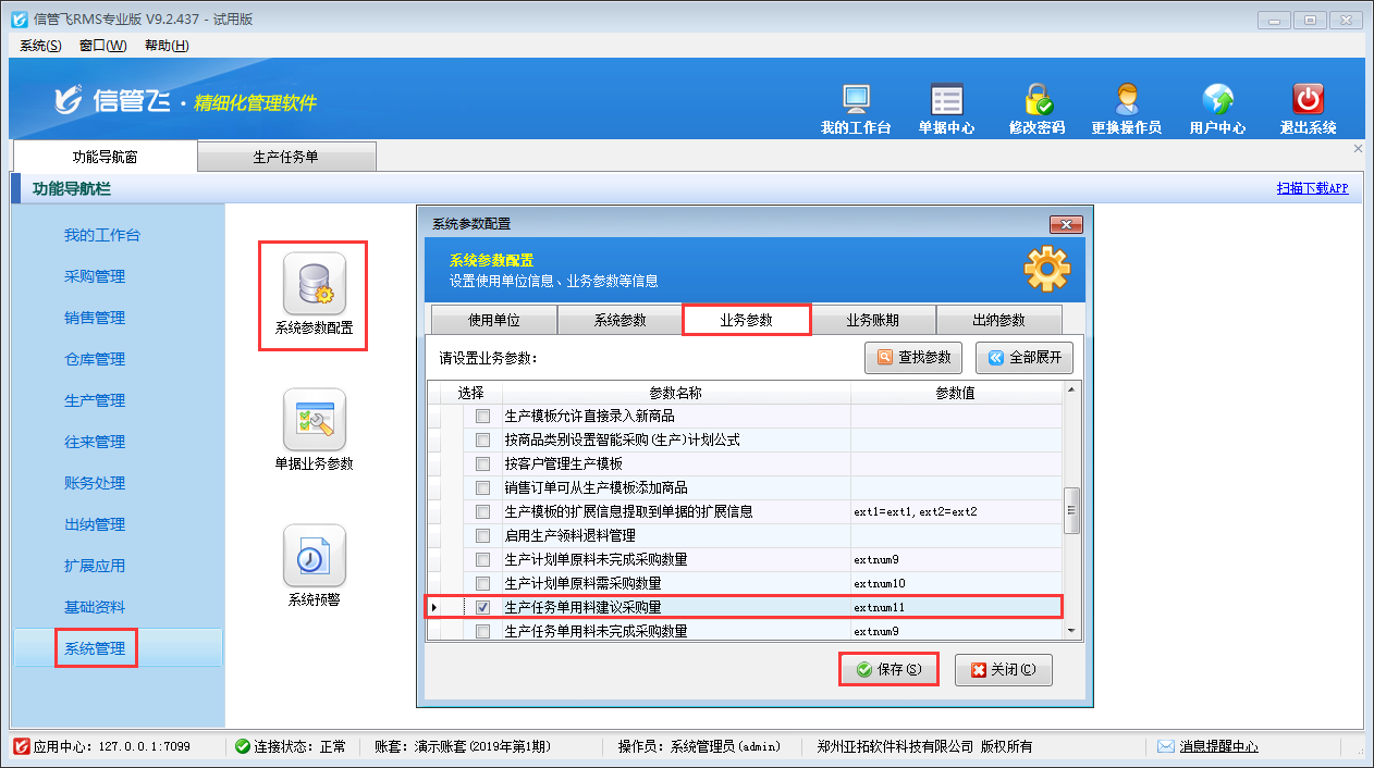 ????在功能導(dǎo)航窗點擊“系統(tǒng)管理”—》“系統(tǒng)參數(shù)配置”—》“業(yè)務(wù)參數(shù)”打開業(yè)務(wù)參數(shù)配置界面,然后在生產(chǎn)管理相關(guān)參數(shù)中打鉤啟用“生產(chǎn)任務(wù)單用料建議采購量”參數(shù),并設(shè)置參數(shù)值,默認(rèn)為“extnum11(擴(kuò)展數(shù)值11)”,如下圖所示。