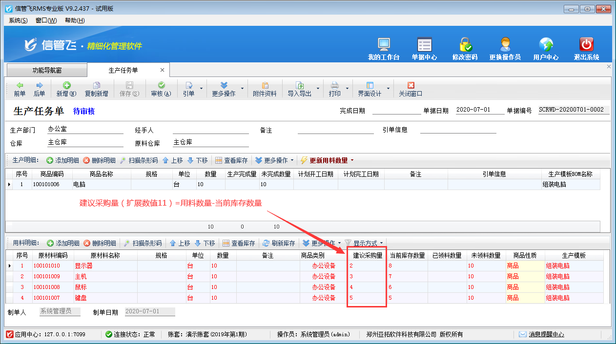 ????然后重新開生產(chǎn)任務(wù)單時,即可根據(jù)原材料用料數(shù)量及原材料當(dāng)前庫存數(shù)量自動計算出原材料需采購的數(shù)量,如下圖所示。