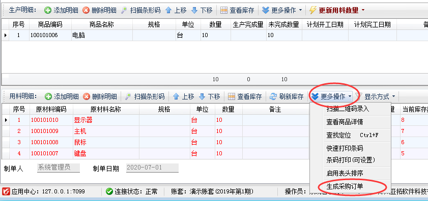 ????點擊“用料明細(xì)”工具欄“更多操作”—》“生成采購訂單”即可將原材料建議采購量直接生成采購訂單便于采購人員進(jìn)行采購,如下圖所示。