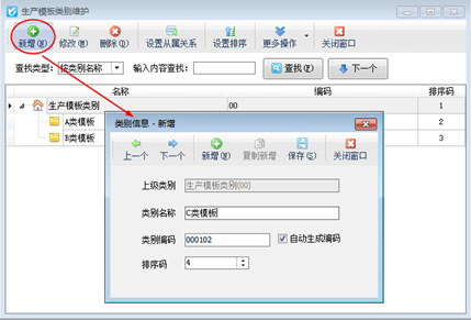 ????模板類別:可以維護(hù)模板類別,后續(xù)可以按照模板類別管理生產(chǎn)模板。點工具欄中的“模板類別”按鈕會彈出“生產(chǎn)模板類別維護(hù)”的界面,在此界面上點“新增”按鈕可以進(jìn)增加類別信息的操作,如圖2所示。