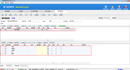 ????(2)當(dāng)需要加工廠進(jìn)行加工時,開“委外加工單”錄入加工任務(wù),會根據(jù)生產(chǎn)模板自動算出需要的原材料明細(xì)。