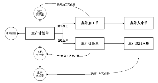 ????②生產(chǎn)計劃明細(xì)中只能輸入計劃數(shù)量(即計劃生產(chǎn)數(shù)量),其他數(shù)量由后續(xù)單據(jù)執(zhí)行后自動更新。下圖為不同業(yè)務(wù)單據(jù)更新相應(yīng)數(shù)量示意圖: