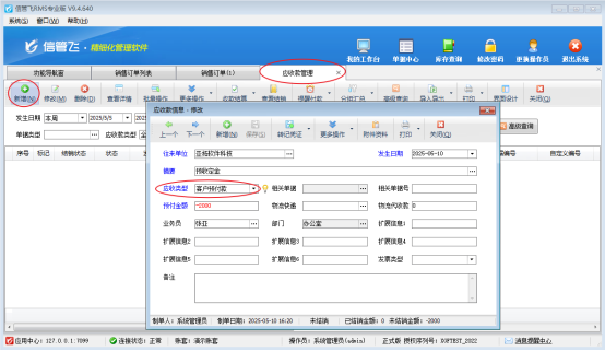 用戶在客戶訂單錄入預(yù)收定金開單保存時(shí),提示“預(yù)收定金不能大于應(yīng)收金額!”,預(yù)收定金是客戶預(yù)訂貨物還沒有發(fā)出系統(tǒng)訂單支持維護(hù)預(yù)收貨款,支持錄入客戶預(yù)付款,遇到以上提示信息該如何處理。 訂單中預(yù)收定金2000元,訂單應(yīng)收金額1800元,開單不能保存。 首先正常錄入客戶訂單,預(yù)收定金不錄入金額,在功能導(dǎo)航窗點(diǎn)擊“往來管理”----打開“應(yīng)收款管理”增加客戶預(yù)付款。 客戶銷售出庫單審核自動(dòng)生成未結(jié)銷的銷售應(yīng)收款
