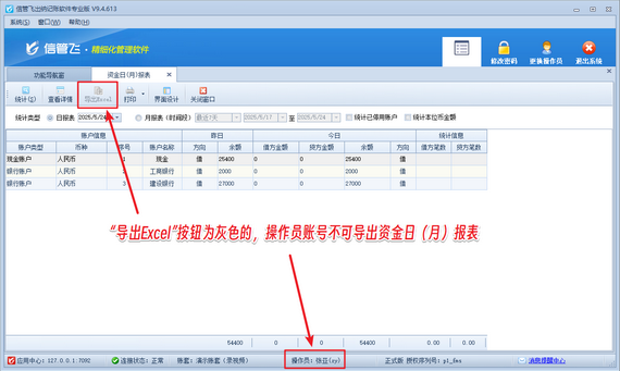 信管飛出納記賬軟件內(nèi)包含豐富的記賬統(tǒng)計(jì)報(bào)表,如現(xiàn)金賬簿、銀行賬簿、資金日(月)報(bào)表、收支類別匯總表等。如果不希望員工賬號(hào)導(dǎo)出這些報(bào)表,如何設(shè)置呢?本篇文章以信管飛出納記賬軟件為例演示一下出納記賬軟件內(nèi)如何設(shè)置操作員不可導(dǎo)出資金日(月)報(bào)表? 演示視頻觀看鏈接:出納記賬軟件如何設(shè)置操作員不可導(dǎo)出資金日(月)報(bào)表演示視頻 登錄軟件,在功能導(dǎo)航窗點(diǎn)擊“系統(tǒng)管理”—》“操作員及授權(quán)”,進(jìn)入“操作員管理及授權(quán)”界面,選擇操作員賬號(hào)“張亞”,在其右側(cè)的功能模塊權(quán)限內(nèi)選擇“出納查詢”,將資金日(月)