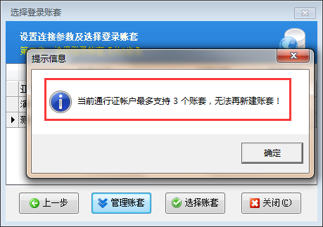 新建帳套時(shí)如果出現(xiàn)如下提示,說明帳套數(shù)量已經(jīng)超過所購買的云帳套數(shù)量。如果需要增加更多的帳套,可聯(lián)系我們客服。