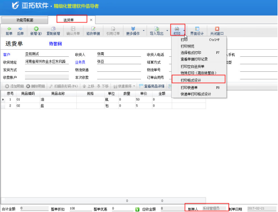 以送貨單軟件為例,選擇一個送貨單單據(jù),選擇“打印”—》“打印格式設計”—》“設計格式”進入打印模板設計器頁面,如下圖1、圖2所示: