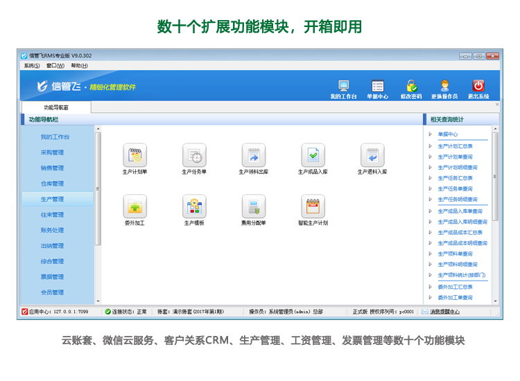 在日新月異的商業(yè)環(huán)境中,企業(yè)的每一步發(fā)展都離不開高效、精準(zhǔn)的管理系統(tǒng)支持。信管飛RMS軟件,作為行業(yè)領(lǐng)先的企業(yè)資源管理軟件,不僅穩(wěn)固了其在財(cái)務(wù)管理、進(jìn)銷存管理等核心領(lǐng)域的領(lǐng)先地位,更以開放的姿態(tài),擁抱變化,創(chuàng)新性地支持另外擴(kuò)展十幾種功能,包括但不限于生產(chǎn)管理、委外加工管理、倉庫掃碼、地磅稱重以及塑編功能等,全方位助力企業(yè)實(shí)現(xiàn)數(shù)字化轉(zhuǎn)型,開啟管理新篇