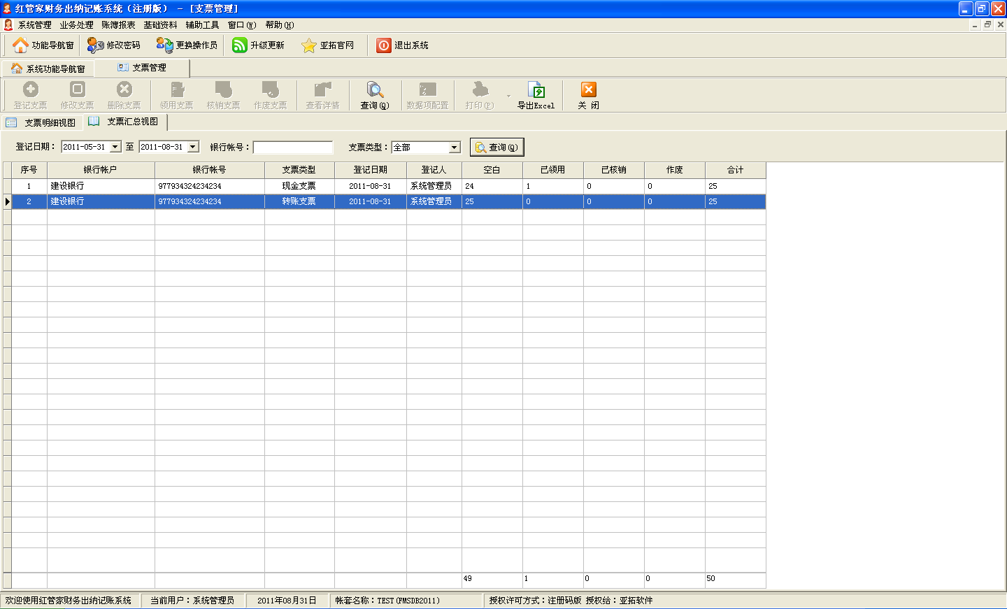 3、支票管理增加匯總視圖,方便查看發(fā)票領(lǐng)用、核銷、作廢情況。