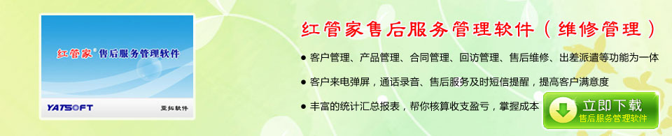 紅管家售后服務(wù)管理軟件是一款針對發(fā)貨、安裝、技術(shù)支持、維修等為一體的售后維修和客戶服務(wù)管理系統(tǒng),主要包括客戶資料管理、合同管理、銷售出貨退貨、配件/零件采購、售后服務(wù)管理、發(fā)貨郵寄管理、客戶回訪管理、出差派遣管理等。支持短信自動通知、來電彈屏、通話錄音等。 經(jīng)典售后服務(wù)管理軟件(維修管理軟件),歡迎下載試用。下載地址:http://www.yats