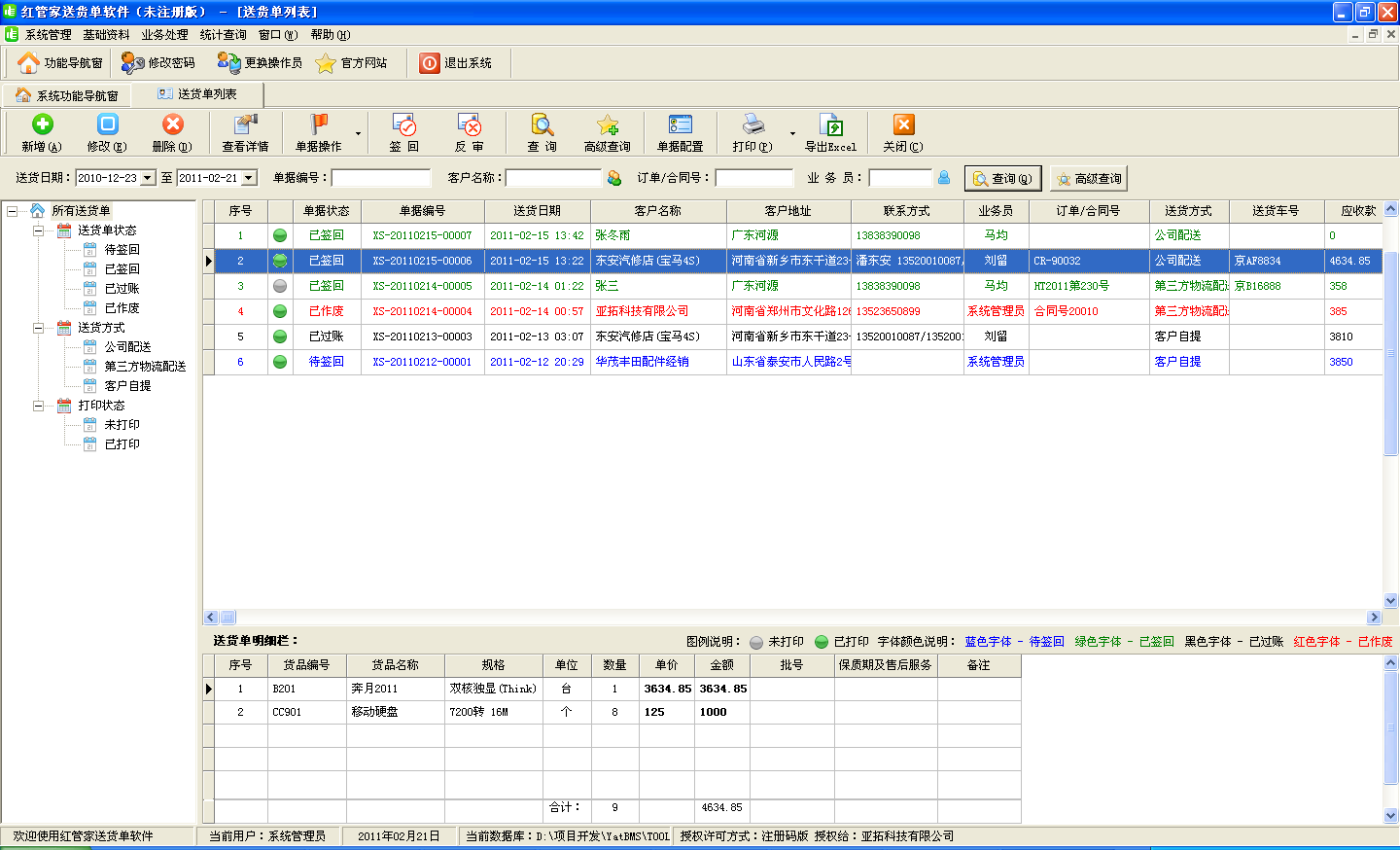 更新說(shuō)明: 亞拓軟件發(fā)布《紅管家送貨單軟件》(送貨單打印軟件、發(fā)貨管理軟件)V1.8(Build 151),在此版本中,我們新增多款對(duì)賬單、年度匯總統(tǒng)計(jì)的打印模版等。 更新日期:2011.03.23程序版本: V1.8(Build 153)1、增加快遞單打印功能,暫時(shí)僅提供申通快遞單的打印模版,后續(xù)我們會(huì)逐步增加主要物流快遞單打印模版。2、新增了3個(gè)