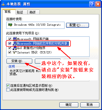 (3)檢查“本地連接”中是否啟用了“Microsoft 網(wǎng)絡(luò)的文件和打印機(jī)共享”,如果沒(méi)有這一項(xiàng),請(qǐng)安裝相應(yīng)的協(xié)議。