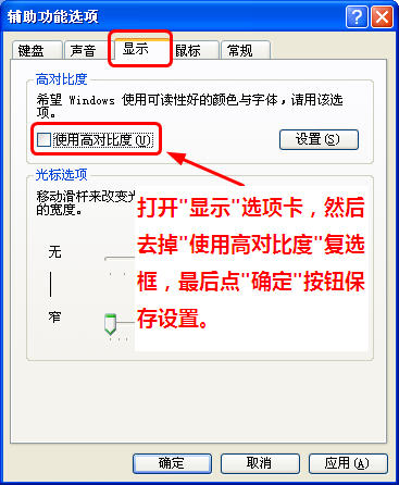 在“輔助功能選項”中,點“顯示”選項卡,去掉其中的“使用高對比度”復選框,最后點”確定“按鈕保存設置。重啟電腦,即可解決問題。