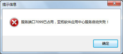 亞拓管理軟件默認使用 7099 通訊端口,如果用戶使用多款亞拓軟件開發的管理軟件,就需要修改一下通訊端口,否則啟動“亞拓軟件應用中心”程序時,軟件會提示如下錯誤信息: