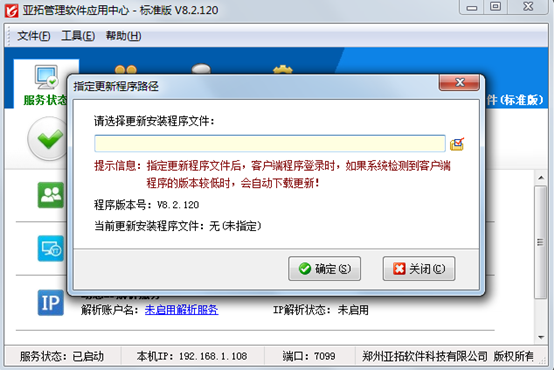 亞拓管理軟件專業(yè)版、標(biāo)準(zhǔn)版、星光版都支持網(wǎng)絡(luò)版(即可以多臺機器同時使用,數(shù)據(jù)共享,數(shù)據(jù)集中存儲在一臺機器上)。為了更好為客戶提供精細(xì)化的管理軟件,我們會不定期的升級軟件程序,網(wǎng)絡(luò)版多臺電腦使用的時候,每次更新程序需要每臺電腦都下載最新版安裝程序進行安裝,非常麻煩。亞拓管理軟件支持在應(yīng)用中心設(shè)置指定更新程序路徑,客戶端程序在登錄的時候,如果檢測到版本號與應(yīng)用中心的版本號不一致,則會自動下載更新。下面我們以亞拓管理軟件標(biāo)準(zhǔn)版為例來介紹一下具體的操作步驟。