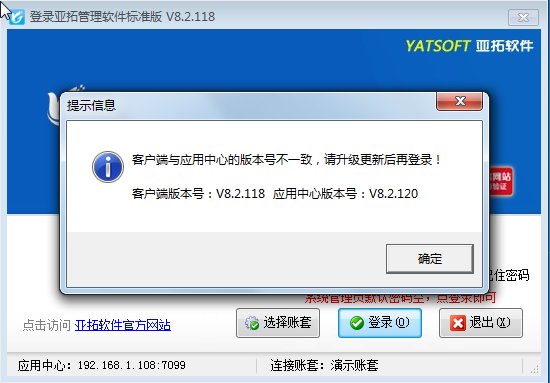 (3)客戶端電腦登陸時會提示“客戶端與應(yīng)用中心的版本號不一致,請升級更新后再登錄!”,我們點擊“確定”,其操作界面如下圖3所示。