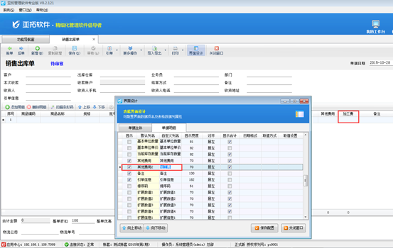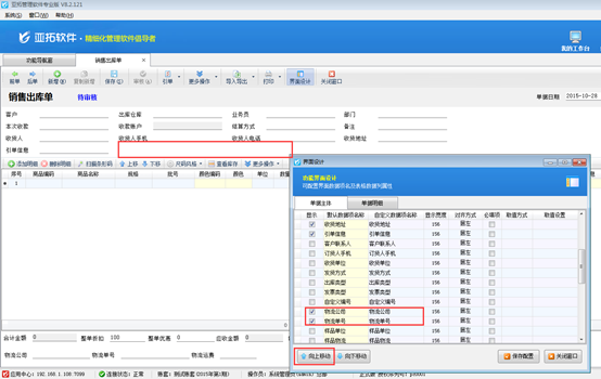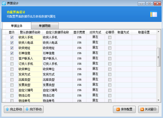 其中界面設計中可分別對單據主體、單據明細進行設計,“單據主體”中如果打勾設置顯示數據項,但在界面上看不到,這是因為這個數據項目上方還有多個不顯示的數據項,遇到這種情況將相應的數據項向上移動,與其他需要顯示的數據項移動到一起,然后“保存配置”按鈕即可。如下圖2所示,可以將“物流公司”和“物流單號”移動到上面即可:
