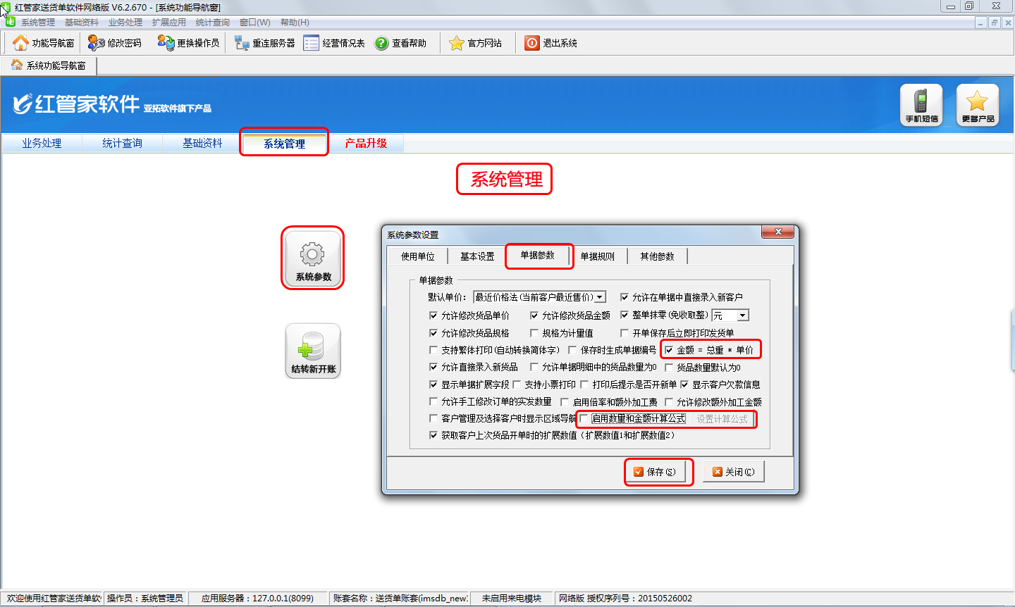 首先打開功能導(dǎo)航窗,點擊“系統(tǒng)管理”—》“系統(tǒng)參數(shù)”—》“單據(jù)參數(shù)”,將默認復(fù)選的“啟用數(shù)量和金額計算公式”選項打勾取消,然后打勾選中“金額=總重*單價”選項啟用按重量計算金額,配置完之后點擊“保存”按鈕保存剛剛所做的配置,如下圖一所示。