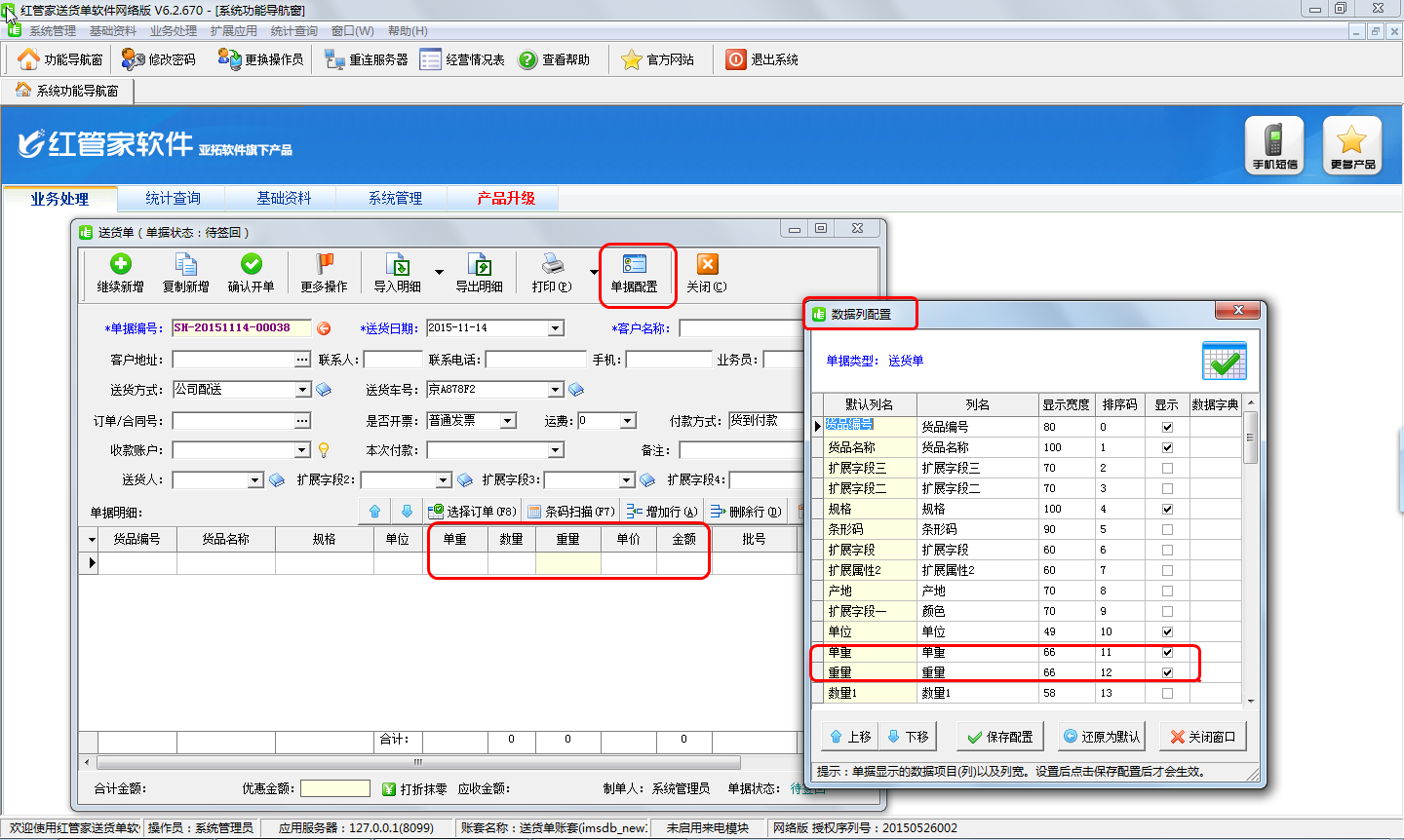 另外在開單頁面點“單據(jù)配置”,會彈出數(shù)據(jù)列配置界面,在數(shù)據(jù)列配置頁面中將“單重”、“重量”打勾顯示出來,下圖以新開送貨單界面為例截圖說明。