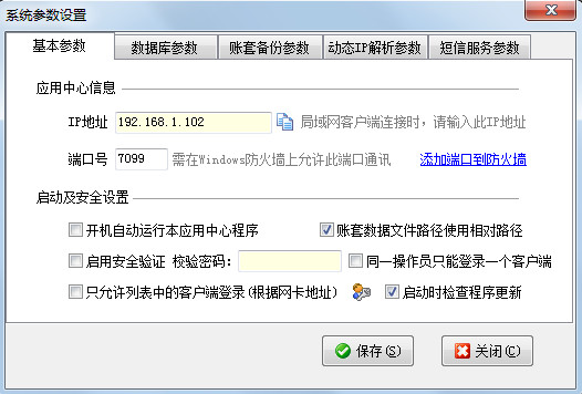系統(tǒng)參數(shù)設(shè)置主要包括基本參數(shù)、數(shù)據(jù)庫參數(shù)、賬套備份參數(shù)、動態(tài)IP解析參數(shù)、短信服務(wù)參數(shù)等,亞拓管理軟件、亞拓倉庫管理軟件的應(yīng)用中心都包含系統(tǒng)參數(shù)設(shè)置功能,下面我們以亞拓管理軟件為例來介紹一下系統(tǒng)參數(shù)設(shè)置的相應(yīng)功能。