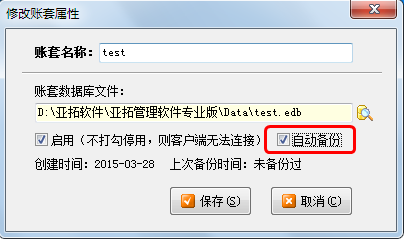 賬套備份參數(shù)可設(shè)置是否啟用自動備份、備份時間間隔和備份目錄。我們強烈建議啟用自動備份,以便賬套出現(xiàn)問題的時候從賬套備份文件中恢復(fù)數(shù)據(jù)。