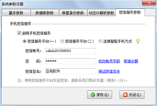 短信簽名:發(fā)送的每條短信必須加入簽名,一般使用公司簡稱,如“亞拓軟件”。不要太長避免占用過多短信字?jǐn)?shù)。