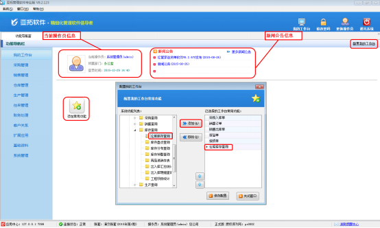 在我的工作臺界面中,首先可以查看當前操作員信息及最新公告信息,另外點擊“添加常用功能”按鈕可以添加當前操作員有權限的常用功能(另外點擊“配置我的工作臺”也可以配置我的工作臺常用功能)。