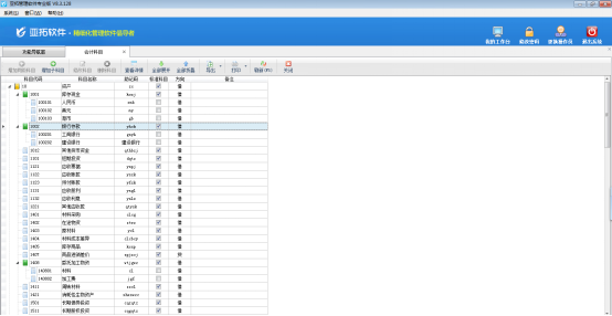 登錄亞拓管理軟件專業版,在功能導航窗點擊“基礎資料”—》“會計科目”,即可進入會計科目管理界面,如圖1所示。
