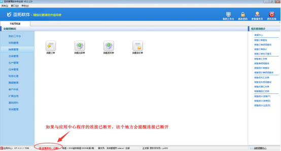 亞拓管理軟件、紅管家倉庫管理軟件、紅管家票據打印軟件都包括客戶端程序和應用中心程序兩個模塊,客戶端程序登錄系統時,應用中心程序是必須打開的。如果主機電腦(網絡版用戶插入加密鎖的電腦為主機電腦)關機或關閉應用中心程序、程序出現異常等,客戶端程序與應用中心的連接就會斷開。應用中心程序再次正常運行后,客戶端程序需要重新建立與應用中心程序的連接。下面我們以亞拓管理軟件專業版為例介紹一下客戶端程序重連應用中心程序的操作。