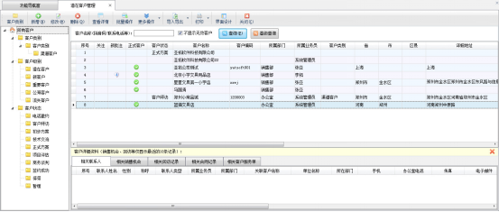 在左側導航樹中可以按照客戶類別、客戶級別、客戶狀態進行分類,點擊后可以顯示相應類別的潛在客戶資料。在右側點擊潛在客戶記錄后,下方會顯示與該潛在客戶有關的聯系人、銷售機會記錄、回訪記錄、合同記錄、客戶服務單記錄等信息(為了加快數據顯示速度,默認只顯示最近10條記錄)。
