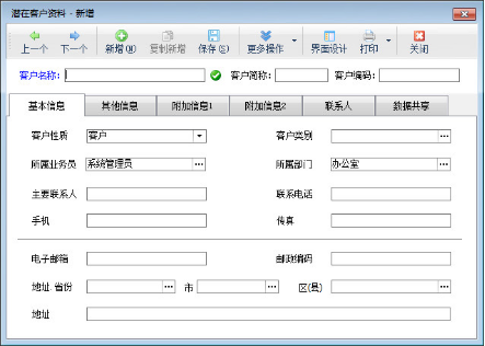 新增潛在客戶:點工具欄中的“新增”按鈕,可以增加新的潛在客戶資料。新增加客戶資料如下圖2所示。
