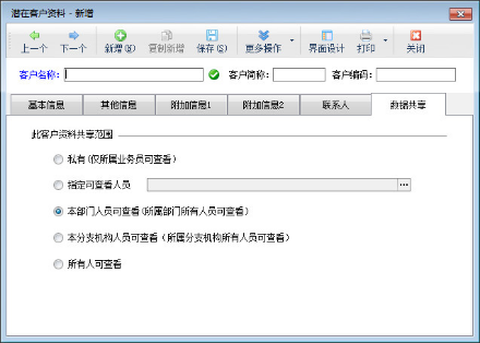 (3)在“數據共享”標簽頁可以設置此客戶資料的共享訪問,即具體哪些人員可以查看這個潛在客戶信息。