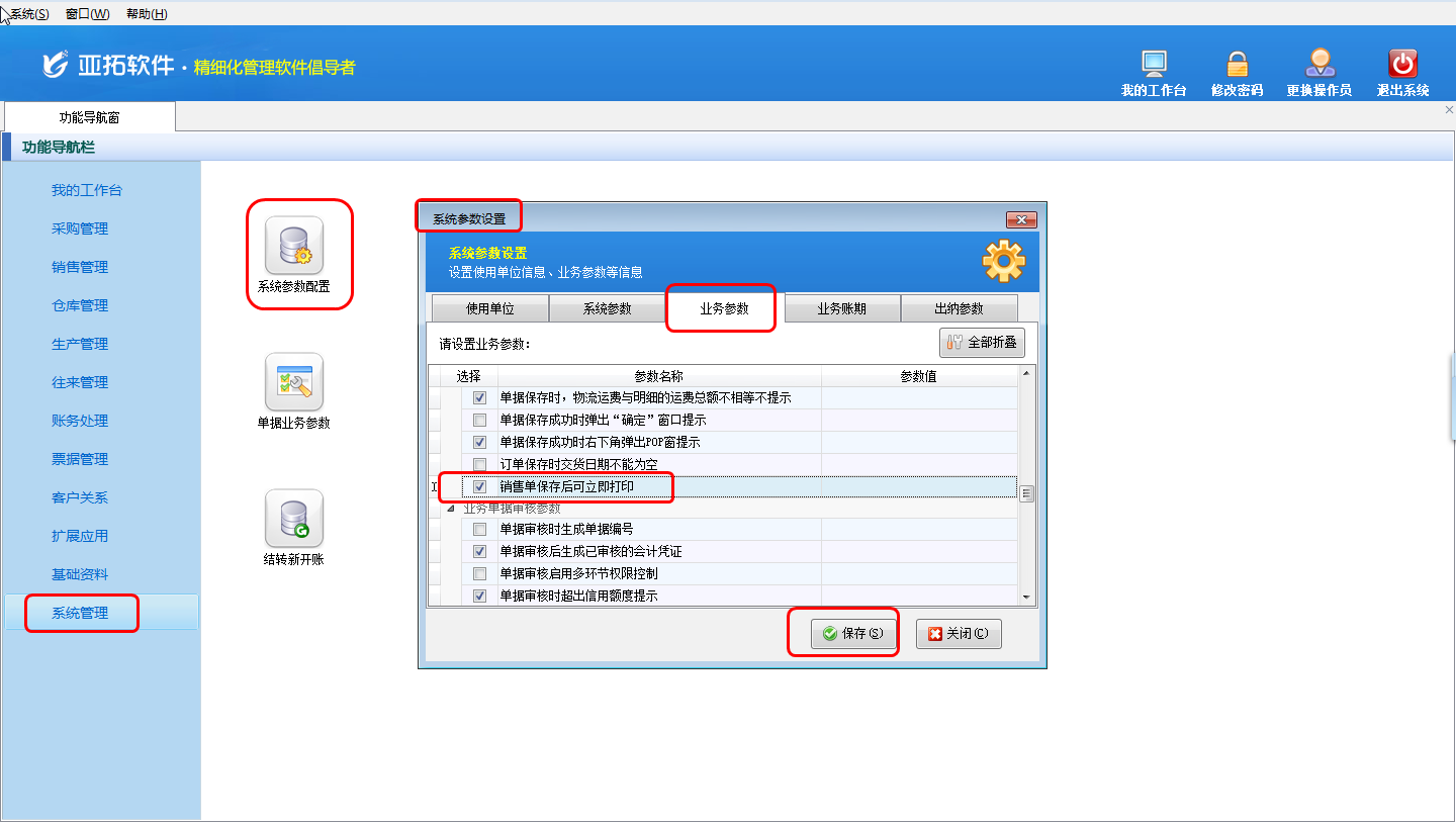 在功能導(dǎo)航窗點(diǎn)擊“系統(tǒng)管理”——》“系統(tǒng)參數(shù)配置”打開(kāi)系統(tǒng)參數(shù)配置界面,在“系統(tǒng)參數(shù)設(shè)置”——》“業(yè)務(wù)參數(shù)”——》“業(yè)務(wù)單據(jù)保存參數(shù)”中打勾選中“銷(xiāo)售單保存后可立即打印”選項(xiàng)啟用“銷(xiāo)售單保存后可立即打印”此功能,配置完之后點(diǎn)擊“保存”按鈕保存設(shè)置即可,如下圖所示。