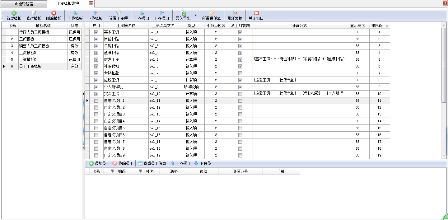 上移模板、下移模板:在工具欄點擊“上移模板”、“下移模板”可以調(diào)整工資模板的顯示順序。