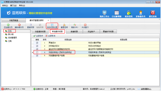 系統(tǒng)管理員登錄軟件,在功能導(dǎo)航窗點(diǎn)擊“系統(tǒng)管理”—》“操作員及授權(quán)”,進(jìn)入“操作員管理及授權(quán)”界面,如圖1所示,選擇一個(gè)操作員,以操作員“王五”為例,點(diǎn)擊“其他操作權(quán)限”,然后取消勾選“可修改其他人員所開出納憑證”,最后點(diǎn)擊“保存權(quán)限設(shè)置”,權(quán)限設(shè)置成功。