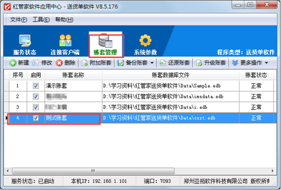 賬套即賬套數據庫,這是一個從會計業務引申出來的概念,賬套數據庫中存儲業務數據。使用軟件前建議新增加一個賬套,用于重新錄入和管理數據。本軟件的賬套是集中在主機電腦上的應用中心程序(紅色圖標)上進行的。我們公司的亞拓管理軟件、紅管家送貨單軟件、紅管家出納軟件等都支持新建多賬套使用。以紅管家送貨單為例,示范下如何進行新建賬套和選擇新賬套使用軟件?
