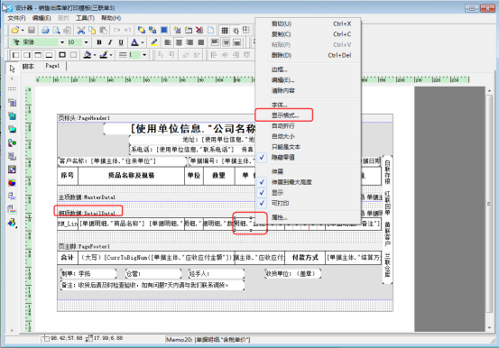 設(shè)置打印模板和單據(jù)界面一致,在開好的單據(jù)界面選擇“打印”—》“打印格式設(shè)計”—》“設(shè)計格式”,進入打印設(shè)計器界面,選擇細項數(shù)據(jù)的單價文本框,右鍵選擇“顯示格式”,如下圖所示: