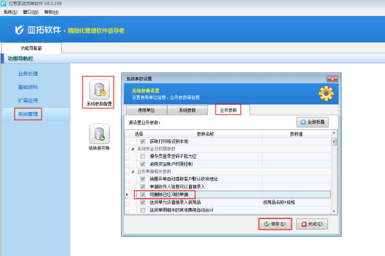 在功能導(dǎo)航窗點(diǎn)“系統(tǒng)管理”—》“系統(tǒng)參數(shù)配置”即可進(jìn)入“系統(tǒng)參數(shù)設(shè)置”界面,如圖1所示,在業(yè)務(wù)參數(shù)中勾選“可刪除已紅沖的單據(jù)”,然后保存。