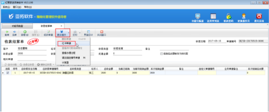 在功能導(dǎo)航窗點(diǎn)“業(yè)務(wù)處理”—》“收款單列表”,找到需要?jiǎng)h除的收款結(jié)算單,雙擊打開收款結(jié)算單,進(jìn)入“收款結(jié)算單”界面,如圖2所示,點(diǎn)擊“更多操作”—》“紅沖單據(jù)”,單據(jù)會(huì)由“已審核”變?yōu)椤耙鸭t沖”狀態(tài)。