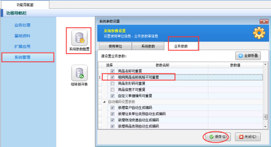 選擇“功能導(dǎo)航窗”的系統(tǒng)管理,選擇“系統(tǒng)參數(shù)配置”打開,選擇“業(yè)務(wù)參數(shù)”中的“相同商品名稱規(guī)格不可重復(fù)”的參數(shù)進(jìn)行打鉤,保存。如下圖所示: