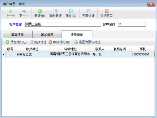 在功能導(dǎo)航窗點“基礎(chǔ)資料”—》“客戶信息”即可進入“客戶信息”界面,如圖1所示,點擊“修改”按鈕,打開客戶信息修改窗口,基本信息中的“詳細地址”就是開單默認地址,點擊“收貨地址”,可以維護其他的收貨地址信息。