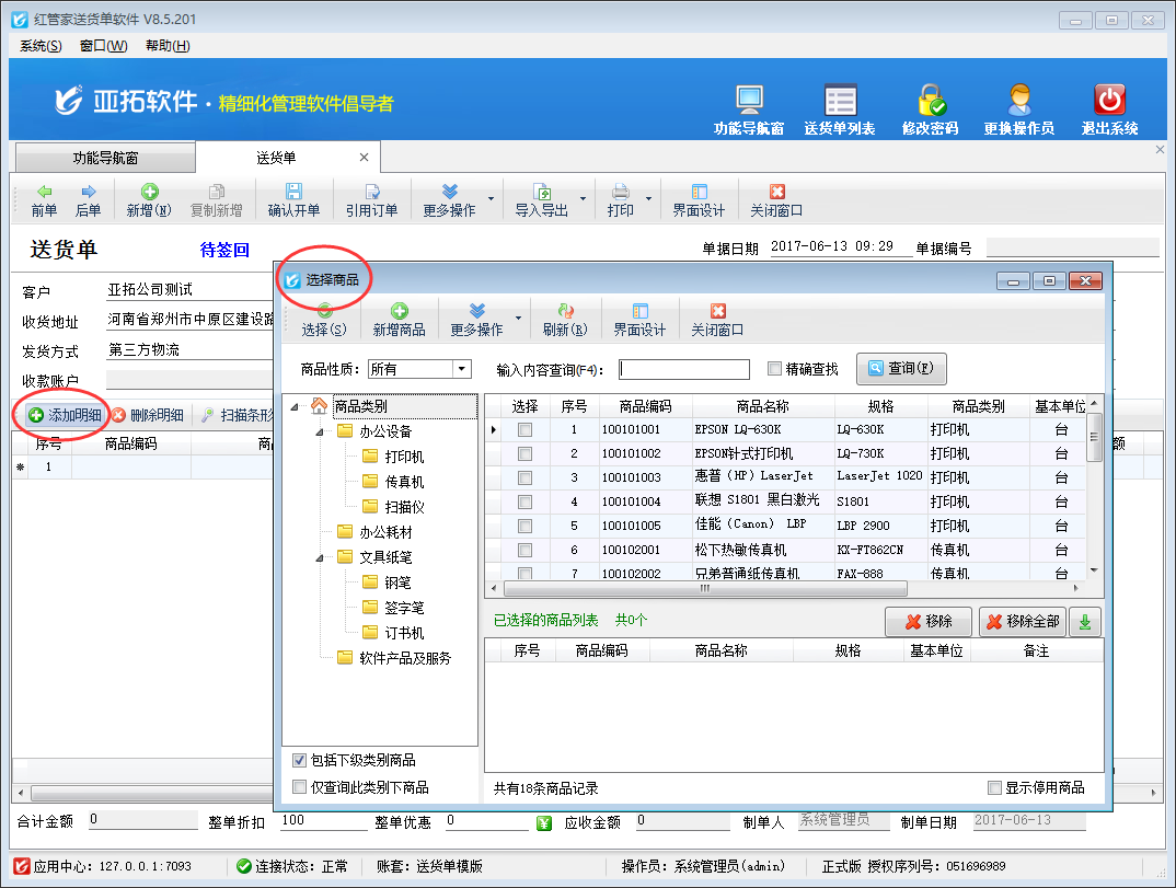 亞拓管理軟件、紅管家倉庫管理軟件、紅管家送貨單軟件等為了方便用戶可以快速開單,在單據(jù)中點(diǎn)擊“添加明細(xì)”按鈕默認(rèn)都是彈出商品選擇窗口(如下圖一所示),可以快速選擇所需商品信息,但是部分用戶在開單時(shí)需要直接錄入新商品,而不是在商品信息庫中進(jìn)行選擇,對(duì)于此種情況,軟件支持設(shè)置在單據(jù)中點(diǎn)擊“添加明細(xì)”按鈕時(shí)不彈出商品選擇窗口,本篇文章我們以紅管家送貨單軟件為例來詳細(xì)介紹一下如何設(shè)置在單據(jù)中點(diǎn)擊“添加明細(xì)”按鈕時(shí)不彈出商品選擇窗口?
