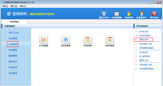 亞拓管理軟件(標(biāo)準(zhǔn)版、專業(yè)版)和紅管家出納記賬軟件(標(biāo)準(zhǔn)版、專業(yè)版)都包括往來管理模塊,都可以對應(yīng)收應(yīng)付款進(jìn)行管理,同時(shí)也支持對超期應(yīng)收款與超期應(yīng)付款進(jìn)行查詢,方便用戶對超期應(yīng)收應(yīng)付款進(jìn)行管理。下面我們以紅管家出納記賬軟件專業(yè)版為例介紹一下超期應(yīng)收款功能的使用。