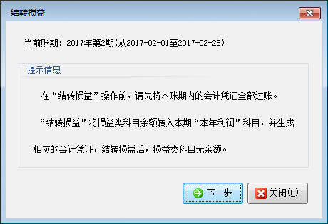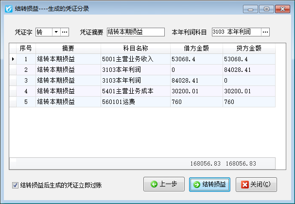 點(diǎn)擊“下一步”按鈕,軟件會(huì)自動(dòng)生成相應(yīng)的憑證分錄,點(diǎn)“結(jié)轉(zhuǎn)損益”按鈕即可結(jié)轉(zhuǎn)余額到“本年利潤(rùn)”科目。可以打勾選擇“結(jié)轉(zhuǎn)損益后生成的憑證立即過(guò)賬”復(fù)選框,則相應(yīng)的憑證會(huì)自動(dòng)審核過(guò)帳。