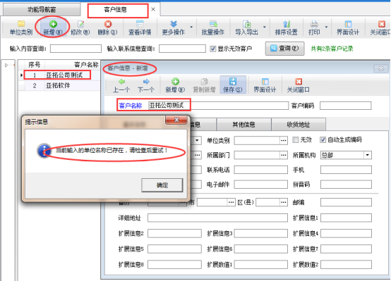 設(shè)置完成后,打開(kāi)功能導(dǎo)航窗的“基礎(chǔ)資料”—》“客戶信息”。對(duì)一個(gè)已經(jīng)增加過(guò)的客戶名稱,點(diǎn)擊新增按鈕,輸入和之前已增加過(guò)的客戶名稱一樣的名稱,保存會(huì)提示“當(dāng)前輸入的單位名稱已存在,請(qǐng)檢查后重試!”,如下圖所示: