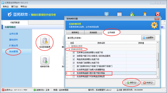 在功能導(dǎo)航窗點擊“系統(tǒng)管理”—》“系統(tǒng)參數(shù)配置”—》“業(yè)務(wù)參數(shù)”,即可進(jìn)入到“業(yè)務(wù)參數(shù)”配置界面,在數(shù)據(jù)選擇參數(shù)內(nèi)打鉤啟用“在選擇商品窗口顯示客戶相關(guān)商品”參數(shù),然后點擊“保存”按鈕保存設(shè)置,如下圖二所示。