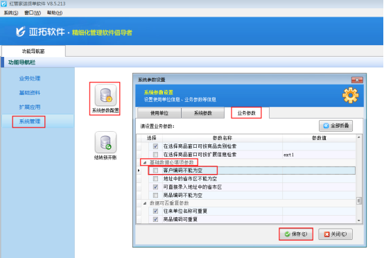 打開“系統(tǒng)管理”—》“系統(tǒng)參數配置”,選擇“業(yè)務參數”的“基礎數據必填項參數”中的“客戶編碼不能為空”,勾選上此參數,點擊“保存”按鈕,如下圖1所示。