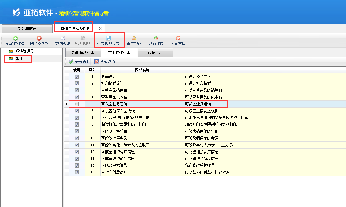 在功能導(dǎo)航窗點(diǎn)“系統(tǒng)管理”→“操作員及授權(quán)”即可進(jìn)入“操作員管理及授權(quán)”界面,選中操作員賬號,在“其他操作權(quán)限”界面將“可發(fā)送業(yè)務(wù)短信”權(quán)限打鉤取消,然后保存權(quán)限設(shè)置,如下圖一所示,設(shè)置操作員“張亞”沒有“可發(fā)送業(yè)務(wù)短信”權(quán)限。