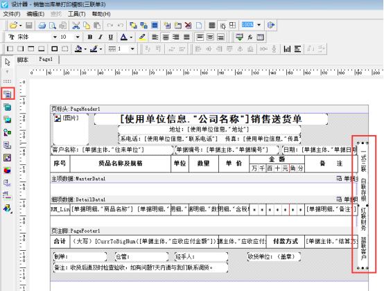 在紅管家送貨單軟件中,在功能導(dǎo)航窗選擇“業(yè)務(wù)處理”—》“新開(kāi)送貨單”—》“打印”—》“打印格式設(shè)計(jì)”,選擇一個(gè)三聯(lián)單的打印模板,點(diǎn)擊“設(shè)計(jì)格式”進(jìn)入模板設(shè)計(jì)器界面,在設(shè)計(jì)器界面左側(cè)的工具欄選擇“