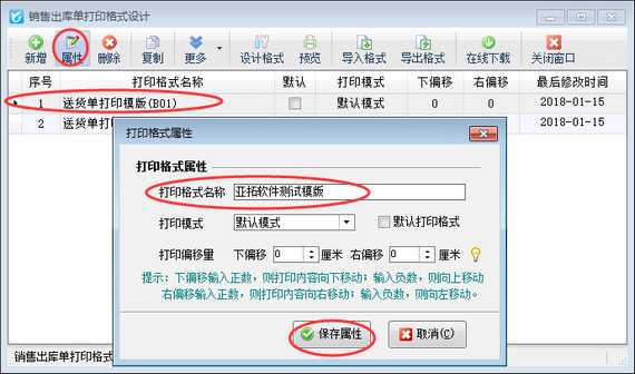 以亞拓管理軟件為例,示范一下如何修改打印格式模版名稱,打開(kāi)一個(gè)已保存的銷售出庫(kù)單,在工具欄點(diǎn)擊“打印”—》“打印格式設(shè)計(jì)”(圖一)打開(kāi)“銷售出庫(kù)單打印格式設(shè)計(jì)”窗口(圖二),選擇“送貨單打印模版(B01)”,然后在工具欄點(diǎn)擊“屬性”按鈕,在打開(kāi)的“打印格式屬性”窗口即可修改打印模版名稱(圖三)。