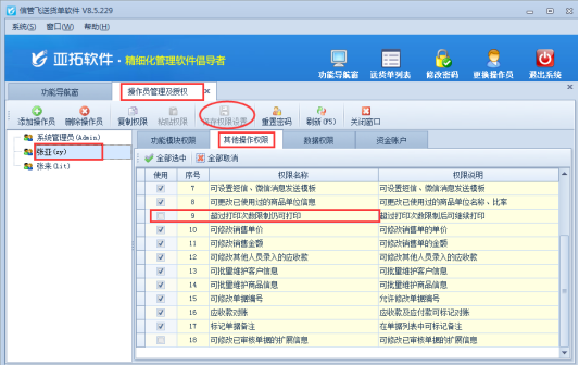 在功能導航窗點擊“系統管理”—》“操作員及授權”進入操作員管理及授權界面,選擇操作員“張亞”(系統管理員默認具有所有權限),在右側功能權限選擇“其他操作權限”,把此界面下的權限“超過打印次數限制仍可打印”取消勾選,保存權限設置,如下圖2所示:
